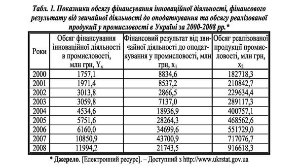 Для дослідження тенденцій розвитку обсягу фінансування інноваційної діяльності в промисловості протягом 2000-2008 рр. застосуємо багатофакторний кореляційно-регресійний аналіз [8], використавши абсолютні значення показників (табл. 1).