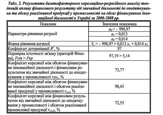 У табл. 2 дано оцінку зв'язку між фактичним значенням обсягу фінансування інноваційної діяльності у промисловості України, фінансовим результатом від звичайної діяльності до оподаткування у промисловості та обсягом реалізованої промислової продукції за допомогою системи коефіцієнтів: коефіцієнта детермінації, F-критерію Фішера та коефіцієнтів кореляції.