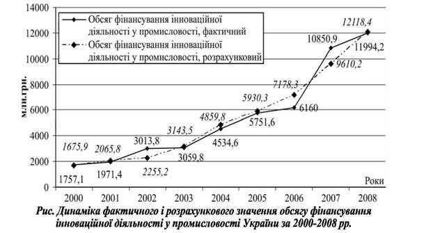 Як видно з табл. 1, спостерігається стійка тенденція до зростання цих показників протягом 2000-2008 рр. Обсяг фінансування інноваційної діяльності в промисловості зріс з 1757,1 до 11994,2 млн... грн., тобто на 10237,1 млн.. грн (6,8 разів); фінансовий результат від звичайної діяльності до оподаткування у промисловості збільшився з 8834,6 млн.. грн до 21743,5 млн... грн, тобто на 12908,9 млн... грн (у 2,5 раза); обсяг реалізованої промислової продукції зріс з 182718,3 млн.. грн до 916618,3 млн.. грн, тобто на 733900 млн... грн (або в 5 разів). Зазначимо, що за досліджуваний період обсяг фінансування інноваційної діяльності в промисловості зростає більшими темпами, ніж обсяг реалізованої промислової продукції і фінансовий результат від звичайної діяльності до оподаткування у промисловості.
