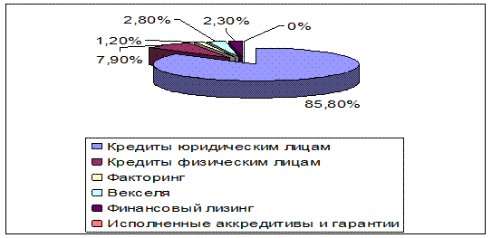 Таким образом, лидирующее положение в структуре кредитных вложений по видам операций занимают кредиты юридическим лицам, их доля составляет 85,8%.