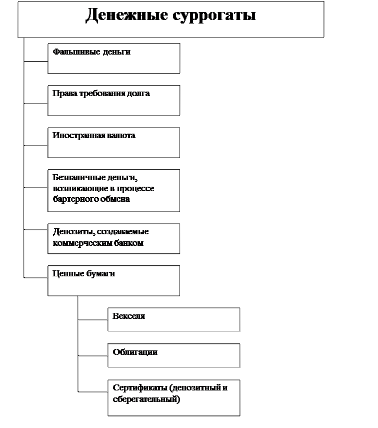 2 Теоретические вопросы определения денежных суррогатов2.1 Денежные суррогаты как элемент денежного обращения Денежные суррогаты - денежные знаки, не предусмотренные законодательством, которые вводятся отдельными предприятиями или иными организациями, а также гражданами самовольно. Основным признаком появления в экономику таких фиктивных средств обмена является нарушением реального товарно-денежного баланса, существовавшего в экономике до введения их в обращение. Как и введение в обращение фальшивых денег, эмиссия и использование во взаиморасчетах денежных суррогатов ведет к увеличению средней цены реальной товарной единицы на рынке, следствием чего становится уменьшение покупательной способности денег, обесценение денежных накоплений. В экономической литературе при описании истории зарождения бумажных денег обычно рассказывается о ювелирах, выпускавших бумажные квитанции на золотые монеты, переданные им на хранение. Эти квитанции выполняли функцию денег во взаиморасчетах. При этом едва ли не гениальным признается решение "неизвестного ювелира" выпустить таких квитанций в несколько раз больше, чем было у него золотых монет на хранении. Причем, несмотря на то, что деяния этого ювелира ничем не отличаются от заурядного мошенничества, указанный прием не только не осужден общественностью, но и взят на вооружение мировым финансовым сообществом[1]. В экономике денежные суррогаты наиболее широко представлены следующими видами:1. Фальшивые деньги;2. Ценные бумаги (векселя, облигации, депозитные и сберегательные сертификаты и т.д.);3. Безналичные деньги, возникающие в процессе бартерного обмена;4. Права требования долга, вытекающие, в первую очередь, из договоров гражданско-правового характера;5. Иностранная валюта, обращающаяся на внутреннем рынке в качестве платежного средства. 2.2 Классификация основных видов денежных суррогатов, используемых во взаимных расчетах субъектами экономики Термин «денежные суррогаты» использовали многие экономисты, когда описывали сегодняшние реалии российской экономики, а именно ситуацию, когда с использованием денежных суррогатов и бартера осуществляется большая часть всех внутренних расчетов в экономике. К сожалению, исследованиям непосредственно денежных суррогатов в отечественной литературе за последние годы посвящено всего несколько статей, а подавляющее большинство исследований рассматривают проблемы бартера, неплатежей, не денежных расчетов, где о денежных суррогатах упоминается лишь вскользь или поверхностно.Рассмотрим подробнее каждый вид денежных суррогатов.1.Фальшивые деньги. С позиции требований, предъявляемых к реальным деньгам, неполноценность фальшивых денег очевидна. Причем, в первую очередь, эта неполноценность вызвана неполноценностью эмитента фальшивых денег, которая проявляется в отсутствии у него полномочий на эмиссию и введение в обращение денег как инструмента обеспечения эквивалентного обмена.Введение фальшивых денег в обращение увеличивает общую массу средствобмена, следствием чего становится нарушение реального товарно-денежного равновесия на рынке, уменьшение реальной покупательной способности денег. 2. Ценные бумаги. По своим экономическим последствиям использование во взаиморасчетах ценных бумаг (денежных суррогатов) в качестве 