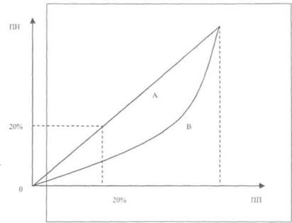 Діаграма Лоренца дає змогу провести своєрідну паралель між податковими надходженнями до бюджету держави та сумарною кількістю платників податків. Ідеально бажаною є ситуація, коли певна кількість платників (наприклад 20 %), сплачують до бюджету двадцятивідсотковий обсяг податкових надходжень (рис. 1.1), що характеризується прямою лінією. Дійсний розподіл доходів і податкових зобов'язань, який існує на даний час у тій чи іншій країні відображає крива лінія.