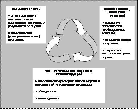 Американский опыт говорит и о том, что систематическая, периодическая оценка эффективности реализации программ является важной частью их жизненного цикла. Именно результаты оценки программы, заключения и рекомендации экспертов во многом определяют, будет ли программа реализоваться дальше в существующем виде, будет ли она реализовываться в измененном виде, либо ее реализация будет прекращена.
