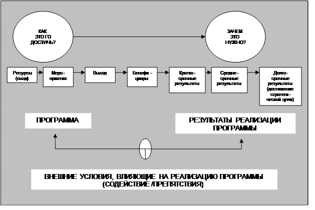 Концептуализация программы представляет собой построение логической модели, иллюстрирующей причинно-следственные связи между элементами программы, определяющие успех ее реализации. Принципиальная логическая модель концептуализации программ, используемая Административно-бюджетным управлением, представлена на рис. 2 .