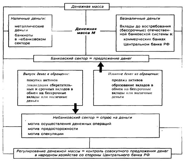Денежная масса, которой располагает народное хозяйство для осуществления операций обмена и платежа, зависит от предложения денег банковским сектором и от спроса на деньги, т.е. стремления учреждений небанковского сектора иметь у себя определенную денежную сумму в виде наличных денег или вкладов до востребования.