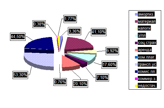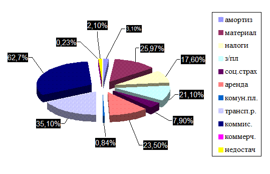 На изображенных рисунках хорошо видны процентные соотношения затрат. Увеличение произошло по следующим статьям: налоговые отчисления, заработная плата, отчисления на социальное страхование, выплаты за аренду помещения, коммунальные платежи, комиссионные платежи и недостачи.