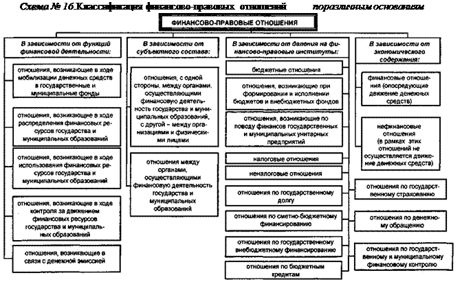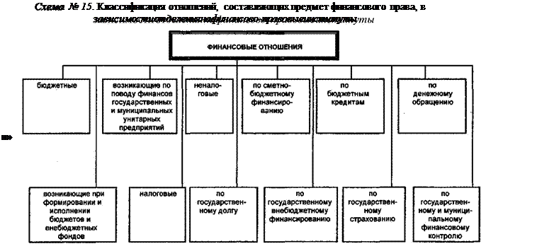 Схема № 15. Классификация отношений, составляющих предмет финансового права, в зависимости от деления на финансово-правовые