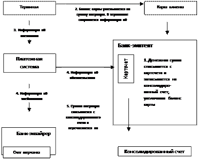 5 - терминал списывает сумму покупки с банковской карты и оформляет слип (он подписывается держателем карты). Одновременно держатель карты получает купленный товар, экземпляр слипа и ему возвращается карта;