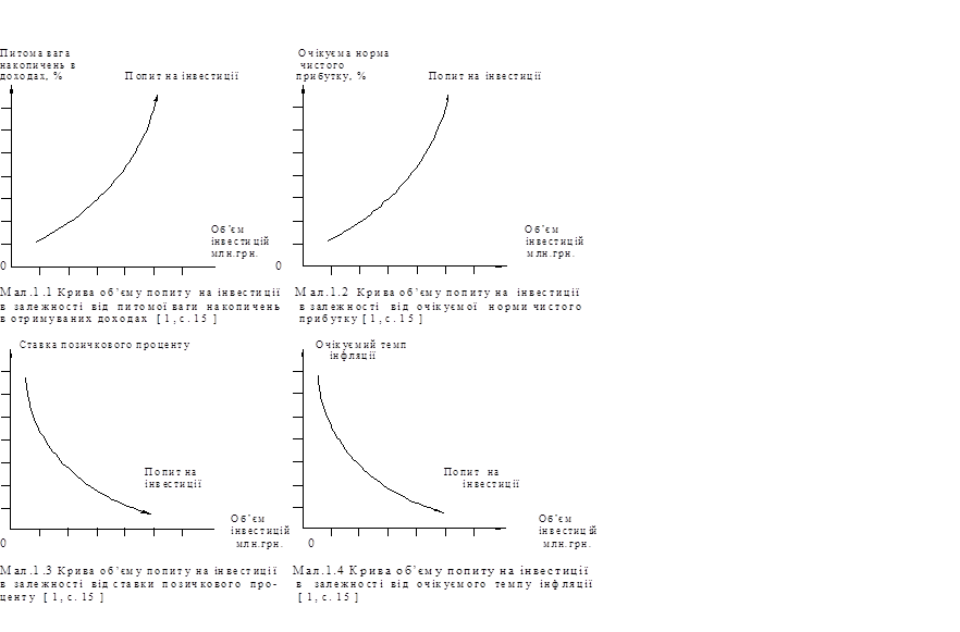 г) серед факторів, що здійснюють значний вплив на об’єм інвестицій, слід зазначити очікуваний темп інфляції. Чим вище цей показник, тим більше буде обезцінюватись прибуток від інвестицій і відповідно менше стимулів до підвищення зростання об’ємів інвестицій (особливу роль цей фактор відіграє в процесі довгострокового інвестування). Криву об’єму попиту на інвестиції в залежності від темпів інфляції показано на Мал. 1.1-1.4