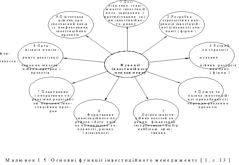 1. Дослідження зовнішнього інвестиційного середовища і прогнозування кон’юнктури інвестиційного ринку. В процесі реалізації цієї функції досліджуються правові умови інвестиційної діяльності в цілому і розрізі окремих форм інвестицій; аналізується кон’юнктура ринку і фактори, які її визначають; складається прогноз кон’юнктури інвестиційного ринку в розрізі окремих його сегментів, пов’язаних з діяльністю компанії.