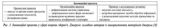 Дослідники Д. Карамишев та А. Демченко [3] у сфері охорони здоров'я визначають три види інноваційних проектів (рис. 1).
