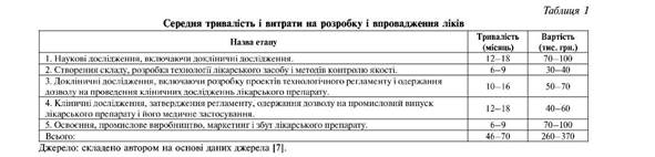 Для прикладу можна проаналізувати дані щодо тривалості і витрат по етапах розробки і впровадження на ринок оригінальних лікарських препаратів в Україні (табл. 1).
