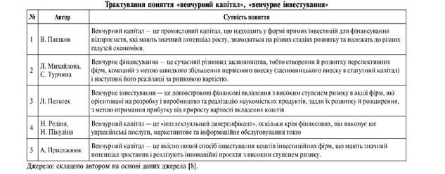 Визначення венчурного капіталу науковці трактують по-різному (табл. 2).