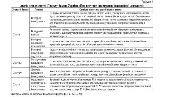 Тому Проект Закону України «Про венчурне інвестування інноваційної діяльності» [12, с. 324—327], розроблений колективом науковців, визначає правові, економічні й організаційні основи здійснення венчурного інвестування інноваційної діяльності (табл. 3).