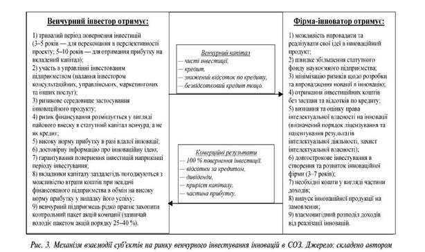 У процесі венчурного інвестування суб'єкти господарювання можуть отримати як прибуток, так і збитки. Таким чином, можемо запропонувати механізм взаємодії суб'єктів на ринку венчурного інвестування інновацій у сфері охорони здоров'я (рис. 3).