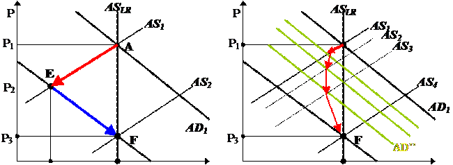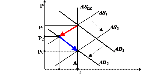 Экономический спад продлится до тех пор, пока население не пересмотрит свои ожидания и не начнет прогнозировать дальнейшее снижение уровня цен, т.е пока инфляционные ожидания не сменятся дефляционными . Тогда экономические субъекты начнут соглашаться на упреждающее снижение или даже полную отмену индексации своих доходов. Когда это случится, кривая совокупного предложения сдвинется вправо из положения AS 1 в положение AS 2 . На фоне дальнейшего снижения уровня цен начнется рост совокупного выпуска и занятости, как показано на рис. 6 синей стрелкой.