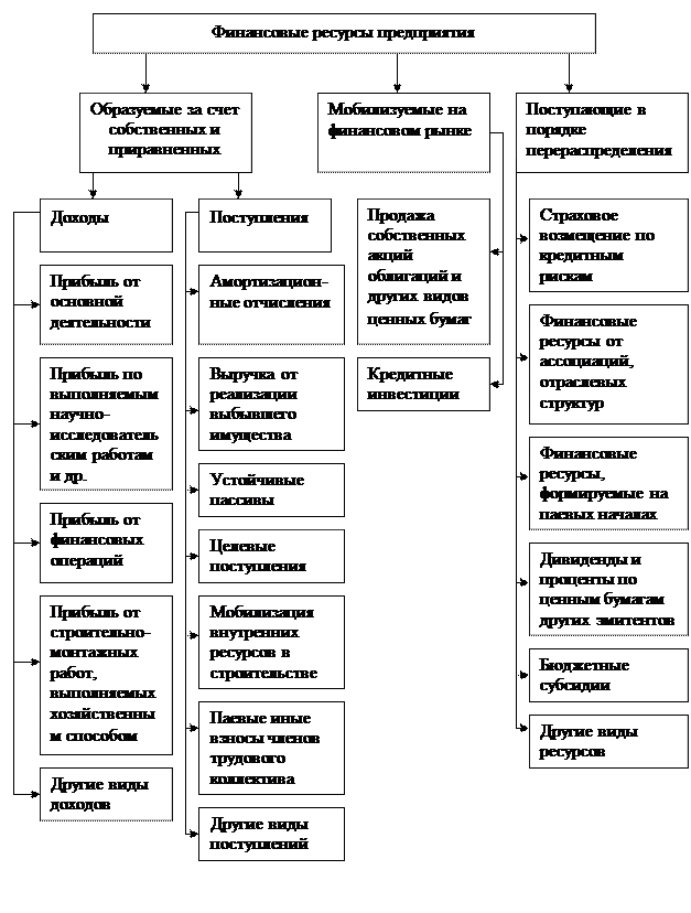 В состав финансовых ресурсов предприятий входят собственные, заемные и привлеченные средства. К собственным финансовым ресурсам предприятий относятся прибыль, амортизационные отчисления, уставный и добавочный капитал, а также так называемые устойчивые пассивы предприятия, включающие источники финансирования, постоянно находящиеся в обороте предприятия, например резервы, образованные в соответствии с учредительными документами предприятия или законодательством. К заемным средствам относят кредиты коммерческих банков и других кредитных организаций, другие займы. Привлеченные финансовые ресурсы — это средства, привлеченные путем выпуска акций, бюджетные ассигнования и средства внебюджетных фондов, а также средства других предприятий и организаций, привлеченные для долевого участия и на другие цели.