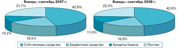 За счет бюджетных средств было профинансировано 16,8% от общего объема инвестиций (в январе—сентябре 2007 г. — 18,5%). Доля кредитов банков составила 11,0% по сравнению с 10,2% в 2007 году [19].