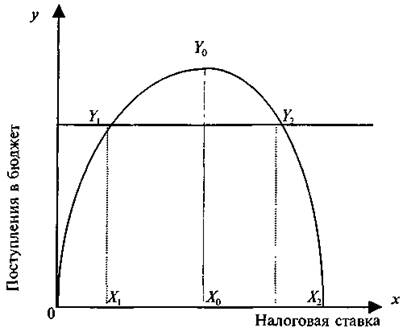 х — налоговая ставка (в % от налогооблагаемой базы); у — среднегодовой объем налоговых поступлений в бюджет; ч Х0 — оптимальная ставка налога, при которой поступления в бюджет достигают максимума — У0 .
