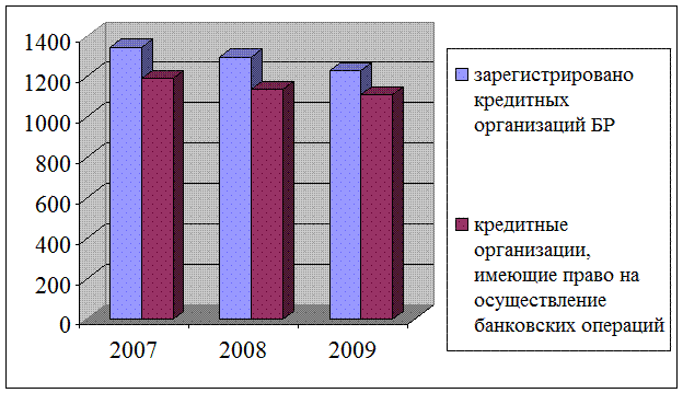 В течение 2007-2009 года, число кредитных организаций, зарегистрированных Банком России, снизилось на 117 , снижение количества кредитных организаций сопровождается также сокращением количества их филиалов.