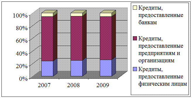 Уменьшение доли кредитов, предоставленных предприятиям и организациям, связано с заметным ростом предоставления кредитов физическим лицам. За 2008 год величина кредитов, предоставленных физическим лицам, увеличилась почти в 1 раз: с 2566736 млн. рублей до 3537211 млн. рублей.