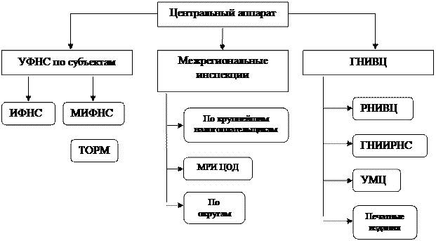 На федеральном уровне функционирует Федеральная налоговая служба России (центральный аппарат, 8 межрегиональных инспекций ФНС России по крупнейшим налогоплательщикам, межрегиональная инспекция ФНС России по централизованной обработке данных, ГНИВЦ и его подразделения). На уровне федеральных округов создано 7 межрегиональных инспекций ФНС России. На уровне субъектов федерации созданы Управления ФНС России (82 управления); на местном уровне - инспекции ФНС по районам, районам в городах и городам без районного деления. В состав Управлений ФНС России могут входить межрайонные инспекции.