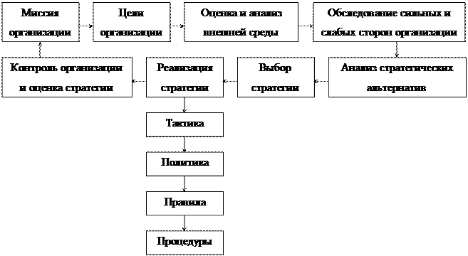 Таким образом, стратегия – это долгосрочное определение направлений развития организации, её целей при предоставлении свободы исполнителям в меняющихся условиях. Стратегическое планирование также является процессом, и состоит из следующих последовательных, взаимосвязанных этапов, представленных на рис. 1.