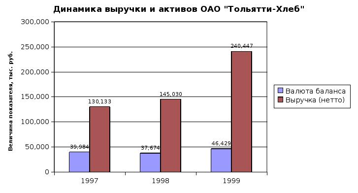 Анализируя показатели работы ОАО «Тольятти-Хлеб» за 1997-1999 гг. следует отметить, что несмотря на общую кризисную ситуацию, предприятие наращивает объем товарной продукции в стоимостном выражении, о чем свидетельствует положительная динамика выручки при незначительном росте активов. Смотрите, пожалуйста, рис. 2.1 и табл. 2.1. В значительной мере это обусловлено постоянным платежеспособным неэластичным спросом на хлебобулочную продукцию, а также инфляционным ростом цен.