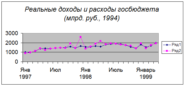 На рис. 3 показаны реальные доходы и расходы государственного бюджета, скорректированные на уровень инфляции.Рис.31