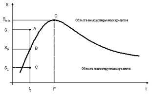 Максимальна сума кредиту, на яку може претендувати позичальник – Smax (точка D), і ця сума може бути видана тільки на час t* .
