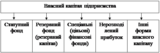 Організація господарської діяльності вимагає відповідного фінансового забезпечення, тобто початкового капіталу, що утворюється з внесків засновників підприємства і приймає форму статутного капіталу. Це найважливіше джерело формування майна будь-якого підприємства. Конкретні засоби утворення статутного капіталу залежать від організаційно - правової форми підприємства. На діючому підприємстві власний капітал має певні основні форми (рис. 1.3).
