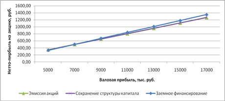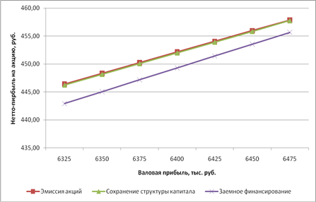 4) обоснован выбор рациональной структуры инвестиций графически (анализ зависимости нетто-прибыли на акцию от величины валовой прибыли). На рис. 3.1 видно, что с ростом валовой прибыли более эффективным способом инвестирования является заёмное финансирование. Однако, в данных условиях (рис. 3.2) выбирается эмиссия акций, т.к. валовая прибыль сравнительно мала (6400,17 тыс. руб.).