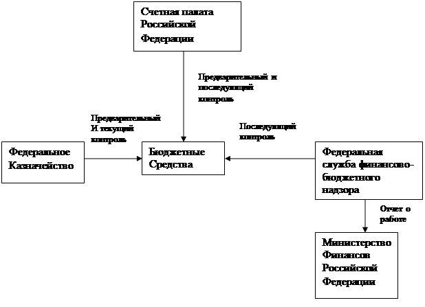 Государственный финансовый контроль осуществляют Счетная палата Российской Федерации, Контрольное управление Президента Российской Федерации, Федеральная налоговая служба, Федеральная таможенная служба, Центральный Банк Российской Федерации, Федеральная служба финансово-бюджетного надзора, Федеральное казначейство, финансовые органы субъектов Российской Федерации, главные распорядители, распорядители бюджетных средств.[1 c.266]