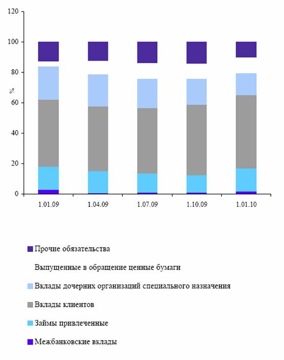 Изменение структуры обязательств Банка на конец первого квартала 2008 года в большей степени связано с привлечением Банком заемных средств, увеличением обязательств, отраженных в категории «Прочие обязательства».
