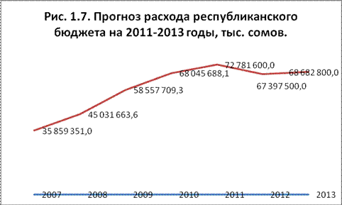 Расходы республиканского бюджета в 2011 году составят 72 781,6 млн. сомов, в 2012 году – 67 397,5 млн. сомов, в 2013 году – 68 682,8 млн. сомов.