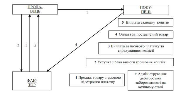 Факторинг – це комплекс фінансових послуг, що полягають у передачі права вимоги коштів (дебіторської заборгованості) за поставлену продукцію або надані послуги банку (фактора) і одержанні постачальником негайної оплати, а також переуступка боргових прав підприємства іншому суб'єктові, який гарантує платіж, звільняє постачальника від необхідності брати додаткові кредити в банку. Постачальник, що працює із клієнтами у розстрочку, може одержати оплату товарів або послуг відразу після їхнього відвантаження. А заборгованість перед банком або факторинговою компанією погашається дебітором.