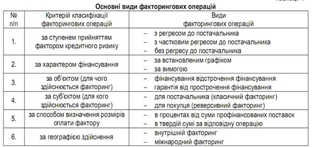 Факторинг можна класифікувати в основному залежно від того, чи здійснюється він на внутрішньому ринку чи передбачає транскордонні відносини, хто з суб’єктів факторингових відносин приймає на себе кредитний ризик – фактор чи постачальник, для кого здійснюються факторингові операції – для постачальника чи покупця, тощо. Отже, наведемо основні види факторингових операцій.