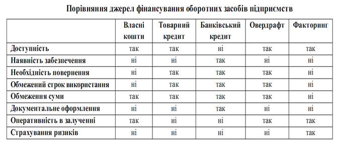 Кожне підприємство використовує різні джерела фінансування своїх оборотних засобів, зокрема це: власні кошти, товарний кредит від постачальника, попередня оплата від покупця, банківський кредит, овердрафт, факторинг тощо. Коротко проаналізувавши та порівнявши вище зазначені джерела фінансування оборотних засобів підприємства, можна навести їх основні переваги та недоліки.