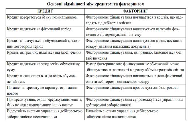 Твердження деяких теоретиків і практиків сьогодення про те, що факторинг є різновидом кредиту є помилковим. Щоб у цьому переконатися, наведемо відмінності між факторингом та кредитом.