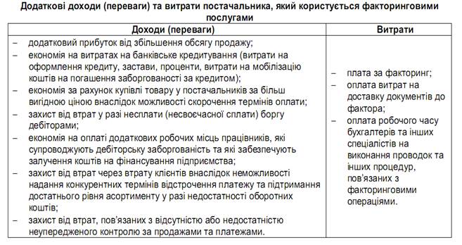 Аналізуючи стан факторингових послуг в Україні потрібно також виділити ряд переваг та недоліків. До переваг на мою думку слід віднести:
