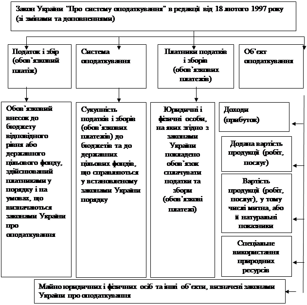 Аналiзуючи систему оподаткування, потрібно звернутись спочатку до базового Закону України «Про систему оподаткування». В ньому дається таке визначення системи оподаткування (вживається також термiн «податкова система»): «сукупнiсть податків i зборiв (обов’язкових влатежiв) до бюджетiв та до державних цільових фондiв, що справляються у встановленому законами України порядку, становить систему оподаткування».