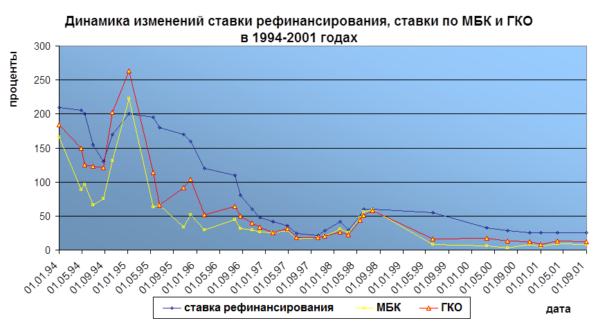 В 1995-1996 годах реальный процент стал не только плюсовым, но и довольно высоким, что постепенно отключало реальную экономику от пользования банковским кредитованием. Этому периоду соответствует положение спада ВВП и промышленного производства не только из-за недостаточного агрегатного спроса, но так же из-за чрезмерной дороговизны кредита. Такая реально жесткая денежно-кредитная политика действительно способствовала снижению инфляции, но при этом убивала реальную экономику и порождала ряд отрицательных явлений в финансовой сфере – нарушение нормального платежного оборота между предприятиями, переход на бартер и коммерческие векселя, а также укрытие денежных доходов от налогового ведомства.