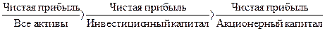Первая группа показателей рентабельности формируется как отношение прибыли к различным показателям авансированных средств, из которых наиболее важными являются ─ все активы предприятия; инвестиционный капитал (собственные средства + долгосрочные обязательства); акционерный (собственный) капитал.