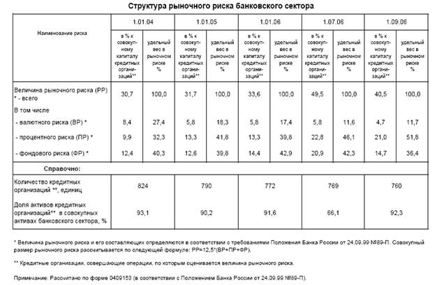 Очевидно, что доля рыночного риска в проценте к совокупному капиталу кредитных организаций увеличилась в 2006 году по сравнению с предыдущими отчетными периодами. Также можно говорить об увеличении удельного веса процентного риска в рыночном риске.