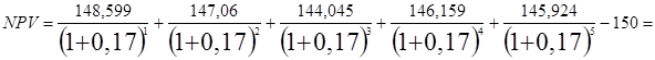 Для здійснення проекту потрібно інвестувати у проект в перший рік 150 грн. Відсоткова ставка 17%.Це буде єдине капітальне вкладення у проект.