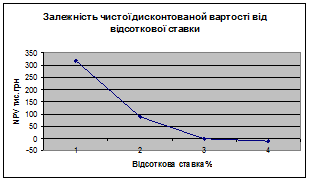 При розрахунку економічної ефективності інвестиційного проекту методом чистої дисконтованої вартості було отримано значення NPV=318,927 тис. грн. При зростанні рівня відсоткової ставки інвестиція може перейти з категорії вигідних в категорію невигідних. Виходячи з динамічності відсоткової ставки в залежності від ситуації на ринку капіталу та умов фінансування проекту, можна вважати недоліком методу чистої дисконтованої вартості неоднозначність характеристики.