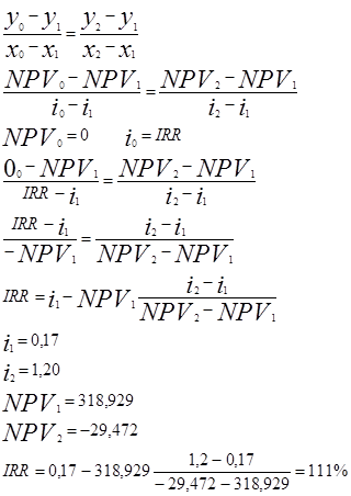 При розрахунку економічної ефективності інвестиційного проекту методом внутрішньої ренти було отримано значення IRR=95%, тобто інвестиція буде мінімально ефективною (NPV=0) при значенні IRR=95%. Якщо IRR>і то NPV>0, тобто інвестиція є ефективною. Якщо IRR=і то NPV=0, тобто інвестиція є мінімально ефективною. Якщо IRR<і то NPV<0, тобто інвестиція є неефективною.