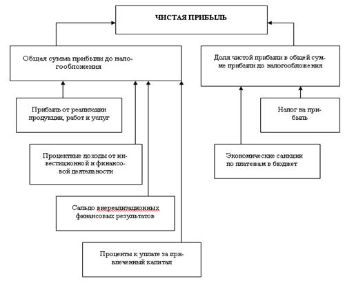Чистая прибыль – сумма прибыли, которая остается в распоряжении предприятия после уплаты всех налогов, экономических санкций и прочих обязательных отчислений. Чистая прибыль является одним из важнейших экономических показателей, характеризующих конечные результаты деятельности предприятия. Количественно она представляет собой разность между суммой прибыли до налогообложения и суммой внесенных в бюджет налогов из прибыли, экономических санкций и других обязательных платежей предприятия, покрываемых за счет прибыли. Величина суммы чистой прибыли зависит от факторов изменения прибыли до налогообложения и факторов, определяющих удельный вес чистой прибыли в общей ее сумме, а именно доли налогов, экономических санкций и др. (рисунок 2).