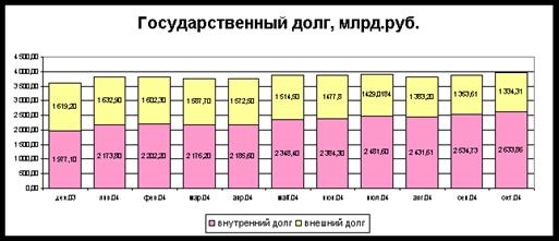 На основании последних данных величина государственного долга Беларуси вплотную приблизилась к 4 трлн.рублей. В структуре государственного долга видны тенденции сокращения внешнего госдолга при постепенном возрастании долга внутреннего, за счет которого и обеспечивается прирост совокупной задолженности. Интересно, что государство не стесняется осуществлять дополнительные заимствования сверх потребностей рефинансирования существующего долга при профиците бюджета, который по итогам января-сентября 2004 года с составил 176 млрд. рублей, или 0,5% к ВВП. Если в первом полугодии прирост внутреннего долга обеспечивался за счет размещения ГКО, то в третьем квартале недоразмещение ценных бумаг было компенсировано выдачей гарантий правительства по кредитам, привлекаемым сельскохозяйственным сектором страны. Так, если на 01.07.2004 в структуре внутреннего долга задолженность, гарантированная правительством, составляла 13% (323,7 млрд.руб), то к 01.10.2004 ее доля увеличилась до 22% (583,3 млрд.руб).