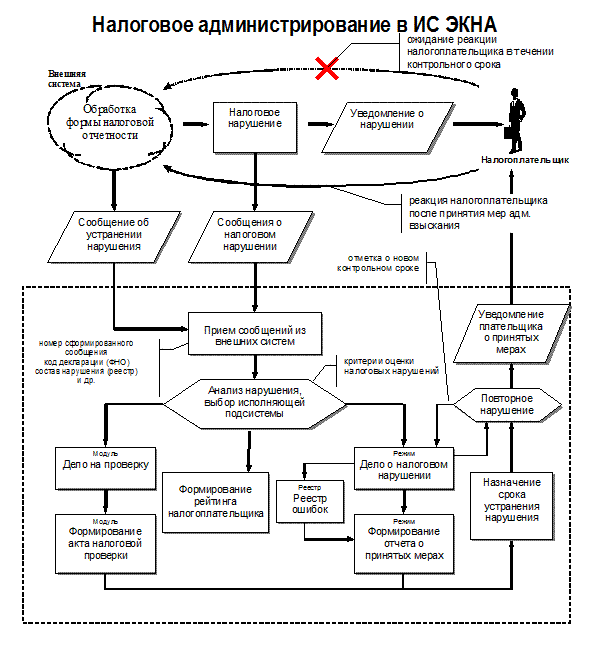 Внешние, по отношению к ИС ЭКНА, информационные системы регистрируют налоговое нарушение при приеме форм налоговой отчетности от налогоплательщика, при этом обеспечивается предварительная обработка налогового нарушения, с целью отсева нарушений, вызванных «техническими» проблемами при обработке налоговой отчетности.
